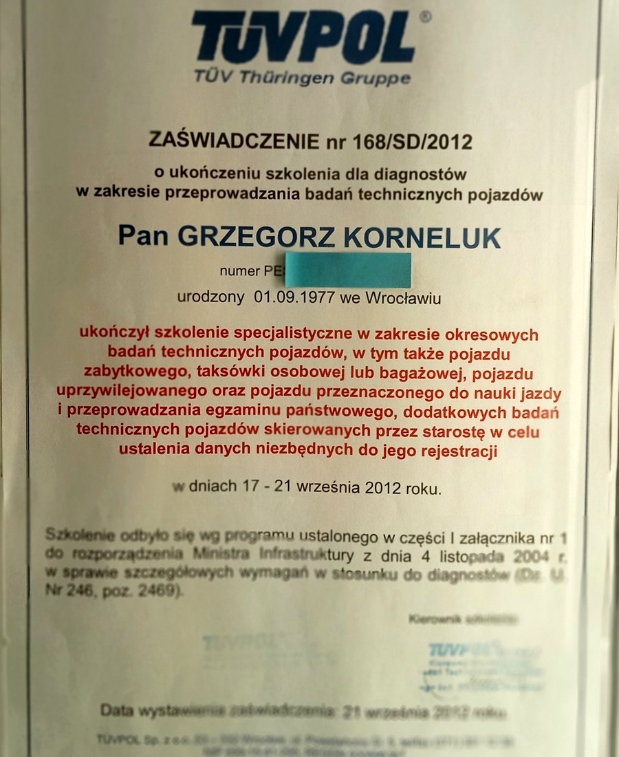 o ukończeniu szkolenia dla diagnostów w zakresie przeprowadzania okresowych badań technicznych pojazdów, taksówek, pojazdów zabytkowych