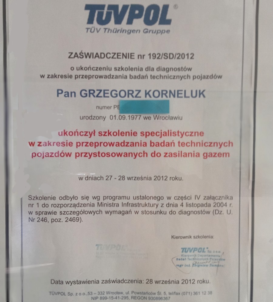 o ukończeniu szkolenia w zakresie przeprowadzania badań technicznych pojazdów przystosowanych do zasilania gazem