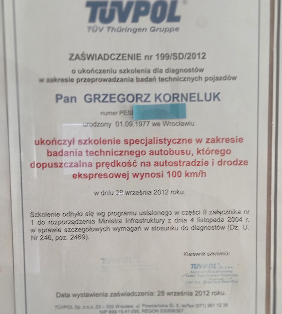 o ukończeniu szkolenia specjalistycznego w zakresie badania technicznego autobusów.