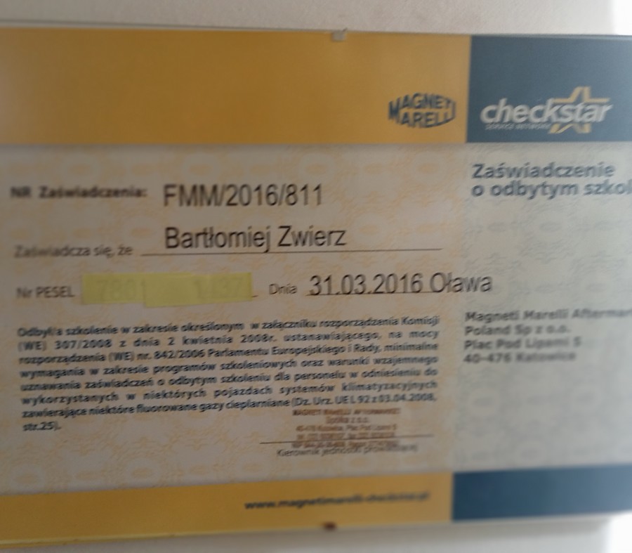 o ukończeniu szkolenia w zakresie wykorzystania w pojazdach w klimatyzacji niektórych fluorowanych gazów cieplarnianych.
